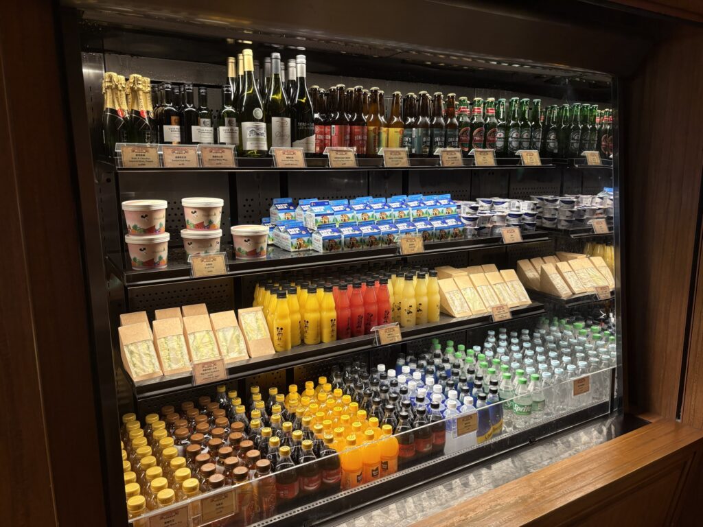 画像の左の方に写っている棚に飲み物類が置いてあります。